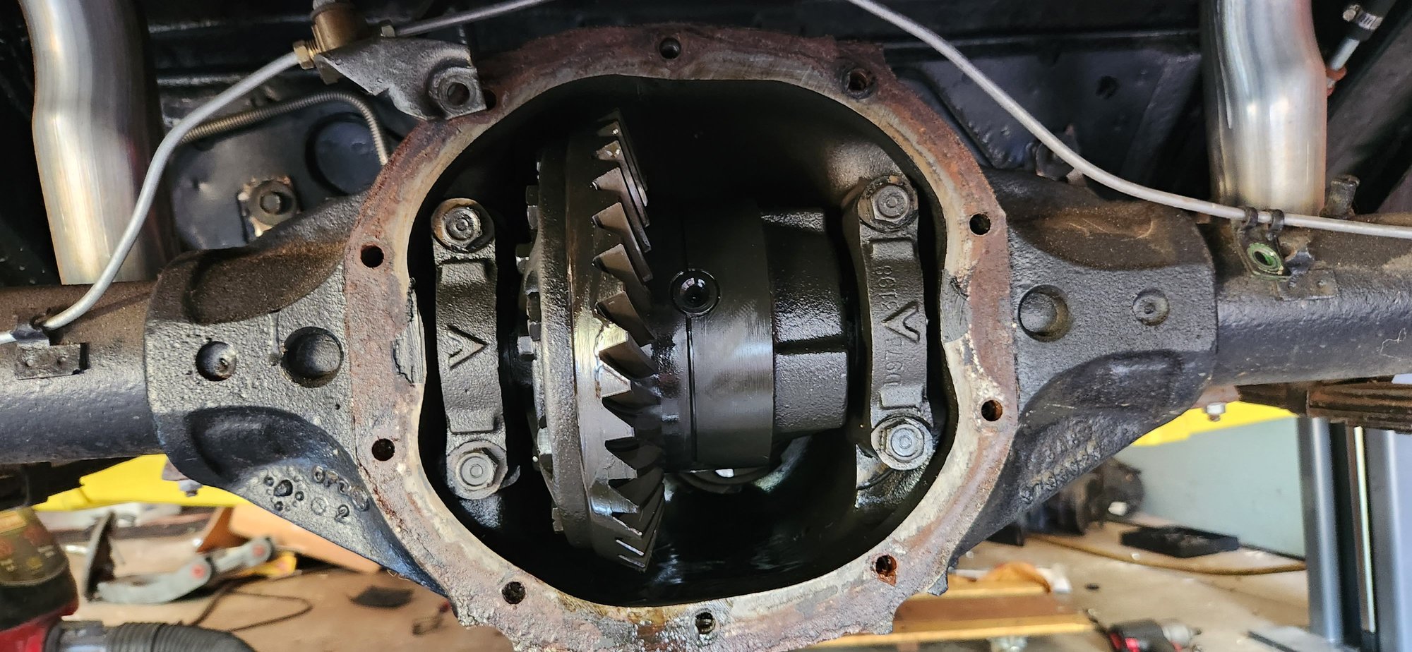 Changing out the brakes on a 69 Camaro to disc. I need to remove the rear axels yet I cant figure this one out on how to remove them. I cant even figure out what diff this is. It also dose not appear to have C-Clip eliminators.