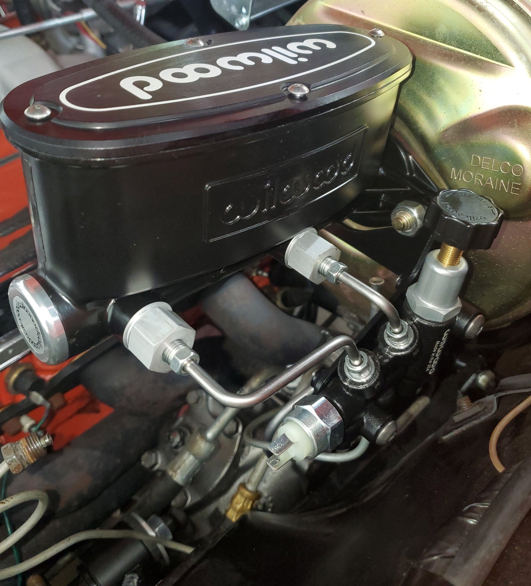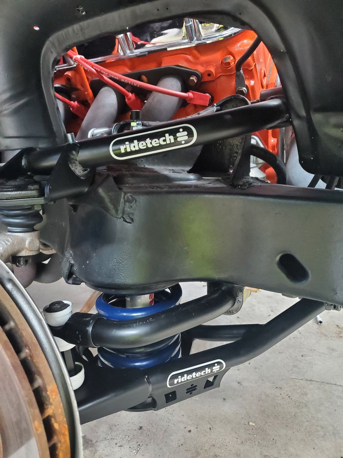 Did a rear disc conversion, new master cylinder with proportioning valve and 6 piston calipers up front. Tubular control arms, springs, ball joints, tie rod ends, sway bar, close ratio steering box and a tilt steering column.