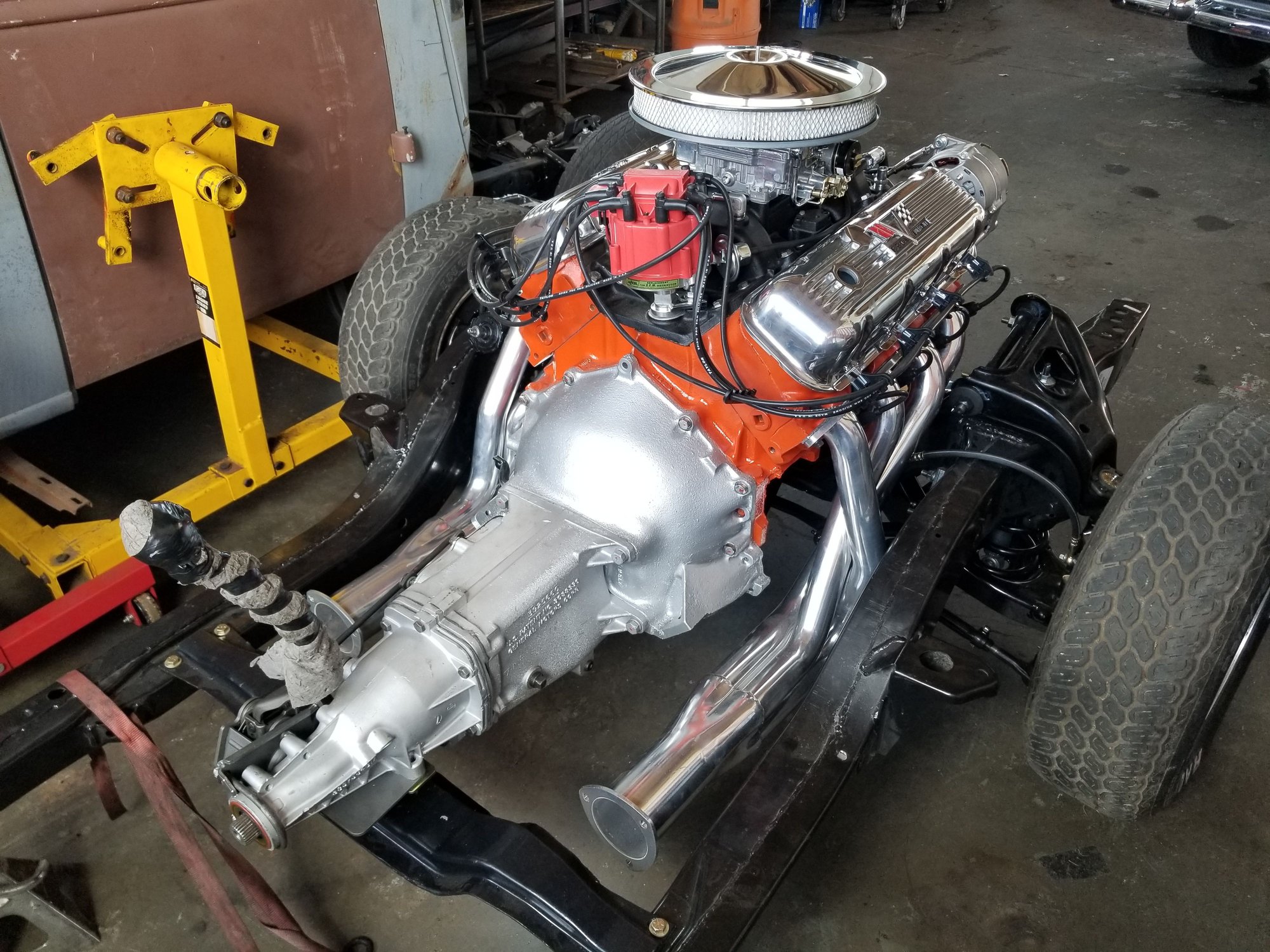 Oh great. I was just worried about whether air cleaner would clear the 396 hood. Now I have firewall issues to worry about... Ha Ha. These guys will do whatever it takes, and we should know in the next week or two, when they install the front sub-frame and extenders. The deal is, this car is in no way original, although original in intent. If they have to cut a notch out of the firewall to clearance the HEI guy, so be it. That mod will in no way effect my enjoyment of the ride, and maybe one day I'll swing by Yacolt and remind you how magic a 1st gen ride feels. "Fundamental" is a term that comes to mind. I can remember driving it down I-5 at 70 mph, and the steering wheel was vibrating in my hands, dancing to every variation in the road, the 327 steel tube headers and glass packs were singing, and I was saying to myself, this has to be the best car stereo ever made. And I was on a stupid freeway, not speeding, and yet having an ADVENTURE. Now, we move up to 396 big block joy, Hooker Headers with FlowMaster F40 series cans on 3" tubes, and oh Lordy. Someday, when my son inherits this car (if it survives me) and assuming there's still gasoline around, he'll have the same goofy grin on his face. And you and I both know the joys of Washington and Oregon back-mountain roads, and how they're made for us to go play. God Bless the Pacific Northwest!!!