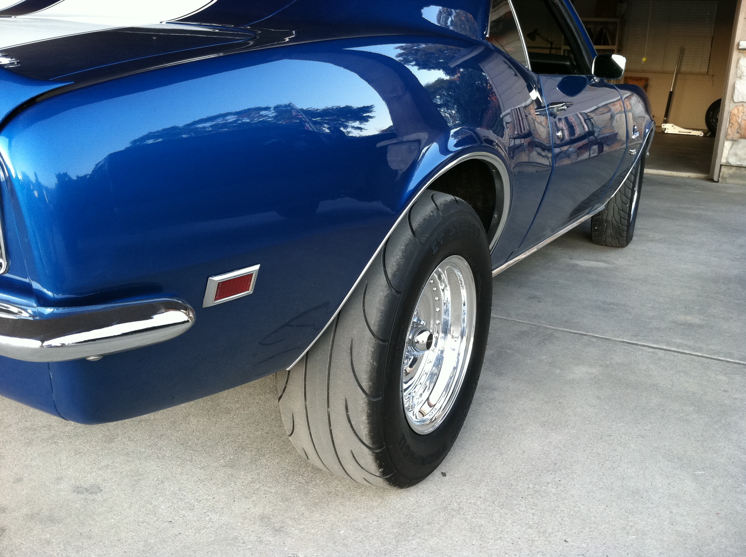 Best bet is to set the rear end on jack stands so that the suspension is weighted and measure the dimension from the hub face where the wheel attaches to the inner fender well or shock which ever is closer. I used a plumb bob in each location and made a mark on the floor. Once you know that distance you can calculate the BS you need based on the rim width and tire section width which should be the widest point of the tire mounted on the rim. Most tire manufacturers will give you the section width and the rim size used for the measurement. For example, a M/T ET Street Radial at 295/55/R15 is 27.8" tall, and 12" wide in section with a tread width of 10.9". Recommended rim size is 8.0-10.5" wide. The key is that the section width is wider than the rim and depending on vertical tire movement and position it could contact the inner fender. A 10 inch could be tight on a 68 without mini-tubs.. Are you expecting that the tire and wheel will extend beyond the fender well?