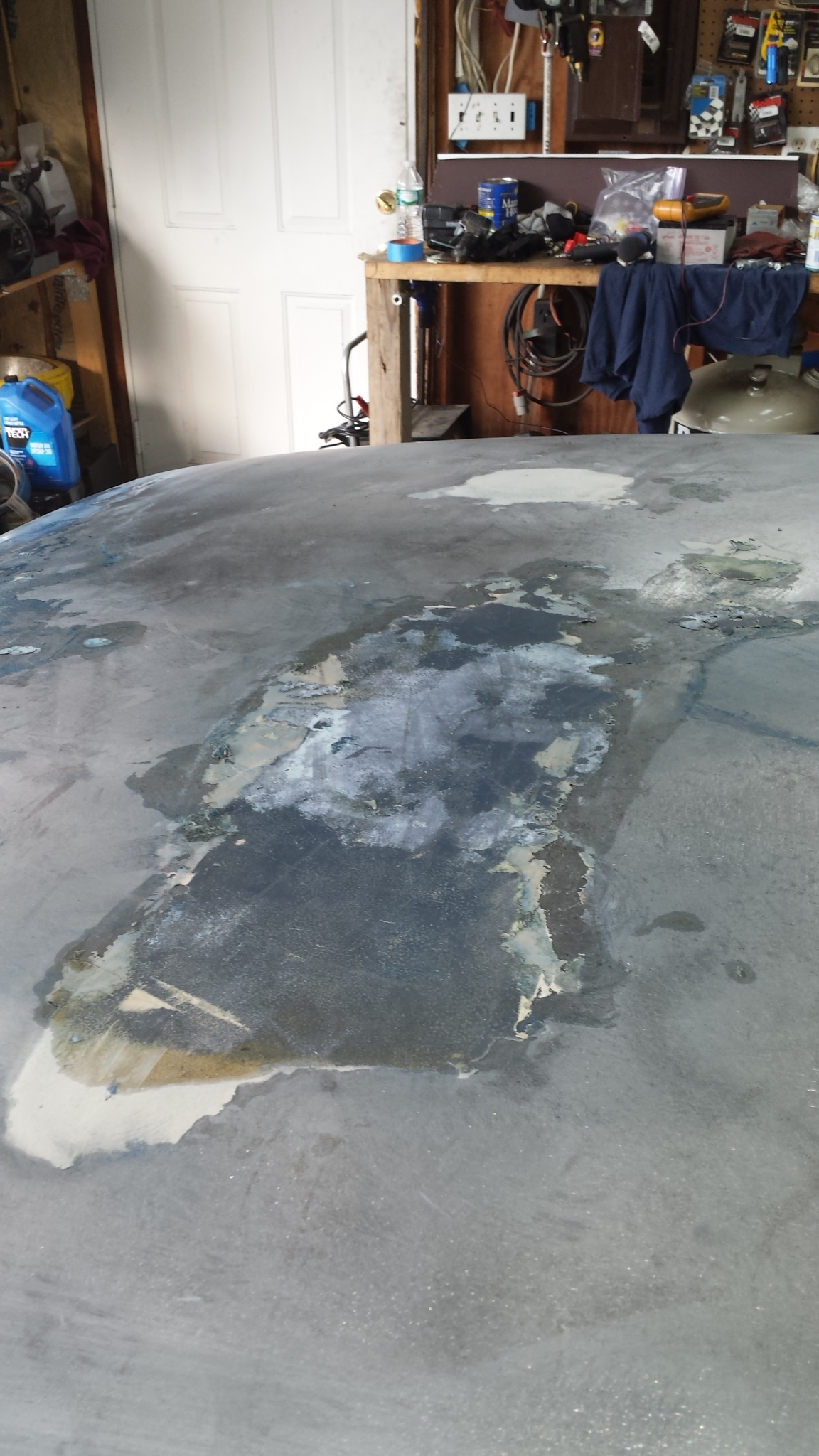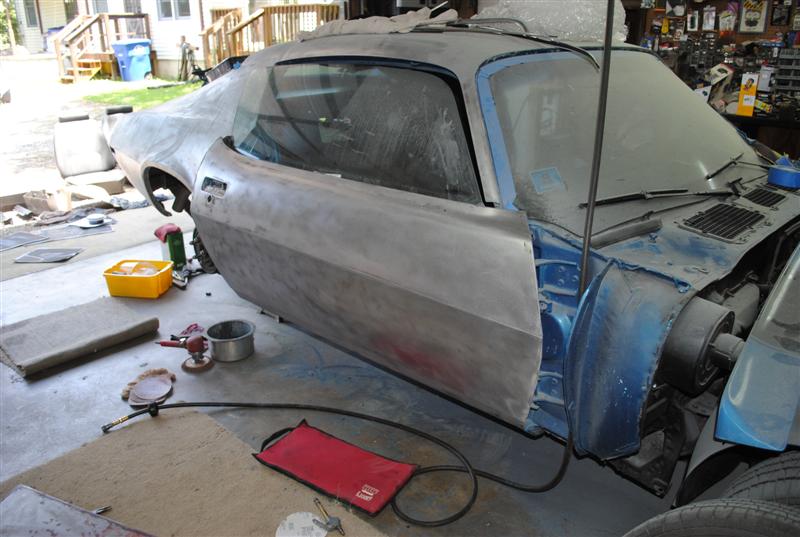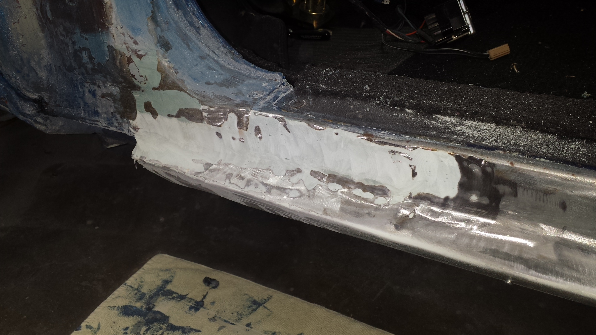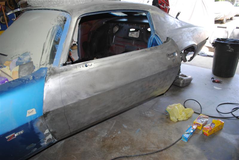well, to use modern 2 stage paint, all the lacquer has to be stripped off (which is what i wanted to do after i got the '68 done). but the more i strip, the more i'm finding out that this car is not as prefect as we were told. we are replacing the tail panel (already on) and trunk lid cause there was nothing but bondo in there. we found that the drivers 1/4 panel was replaced after sanding. but the real answers showed up last night. there was a bunch of bondo in the drivers rocker. i finally got the door off and started sanding the jam. this car was clobbered on the drivers side. sucks!