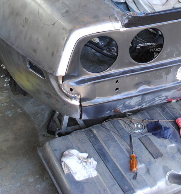 the left 1/4 was brazed in. 2 pics up, ya see that nice hunk of bondo at the roof line, that is one place. the other was in the trunk jamb under the trunk hinge. the 3rd is where the QP meets the body in the door jamb (that is actually pretty nice). the wheel well was pretty botched, they pinched the QP to the outer wheelhouse and made all these little dents that were filled with bondo. where the QP meets the lower valence was pretty bad too. there was a gap, about 1/2" between the two and was filled with braze. then they drew an line in the bondo to make it look like the seam was there (HAHA, pretty bad huh). with the new tail panel on, i have a 1/2" gap between the QP and the valence.