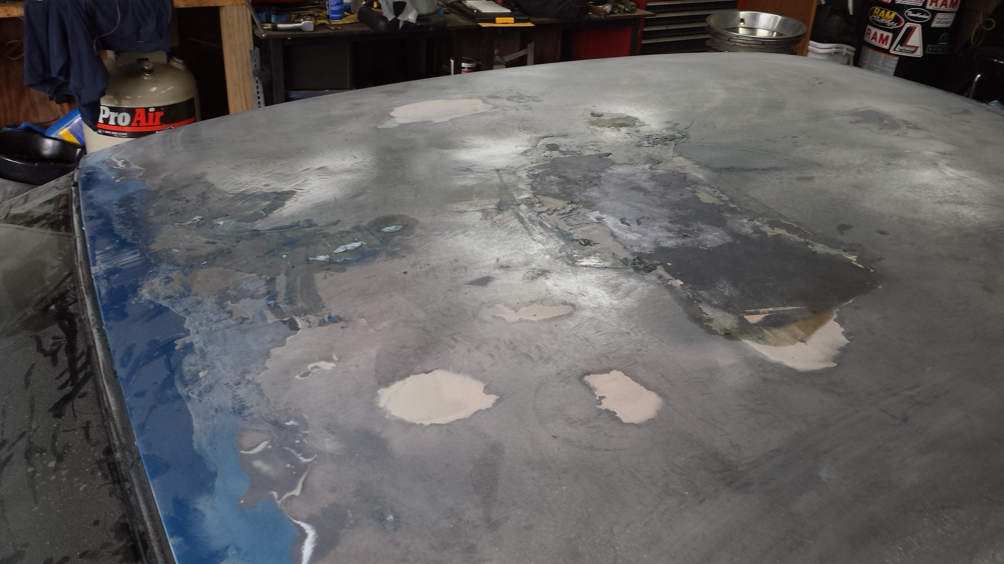 One of my present projects is an old '63 Falcon that I built into a late 60's style gasser. When I found a screw through the passenger door trim I removed it and the trim popped out about 1/2". I got a straight edge to check, and the door was not level, so I knew there was filler in it. I pulled the trim and began grinding the primer and filler down to bare metal. It was about 3/4" thick, and still low from true level! Once I stripped the whole door I found the original dent not pulled at all. They drilled some holes to attempt pulling, but that was all. Had to pull the door panel out past flush, and then tap it back down to get it all trued up. Welded up the holes, and gave it a skim coat. Found the front fender was actually high with filler, and when I began taking it down I found the dent was tiny. Someone had put 3/8" thick filler in it, and after grinding it all off, it didn't need anything but a small dab of filler to get it right.