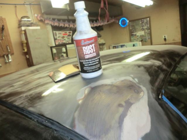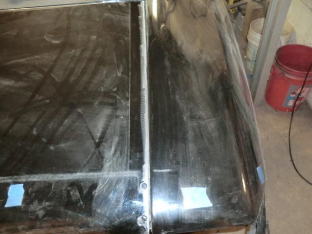 Havn't updated in a few. I'm still sanding.I posted in anther thread about the dent in the roof corner. When I sanded down I found rust under the bondo. Very light, but it showed as a blemish in the paint. I sanded it all clean then treated with eastwood rust converter. I'll sand and prime over this. I had to cut one side of the trunk lid. I could get it lined up on threee sides only. After hours of fooling around I cut 1/8" dowm to 0 on the left side.