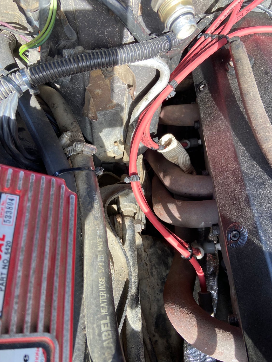 only issue is number 6. The clearance is soooo minimal as in its just not touching anything. Any ideas on a good set of looms or keepers or whatever they are called to keep the wires from melting on the headers? This is a "not stock" 350 in a 1979 with hooker competition headers. Only cylinder 6 has this odd issue.