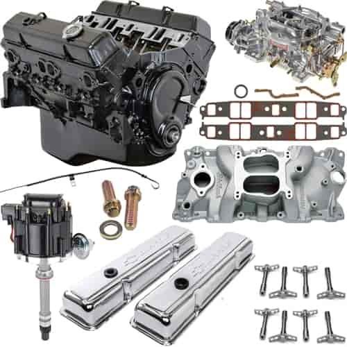 That Jegs engine has everything you need carb to pan gaskets valve covers and all and has an HEI dist.