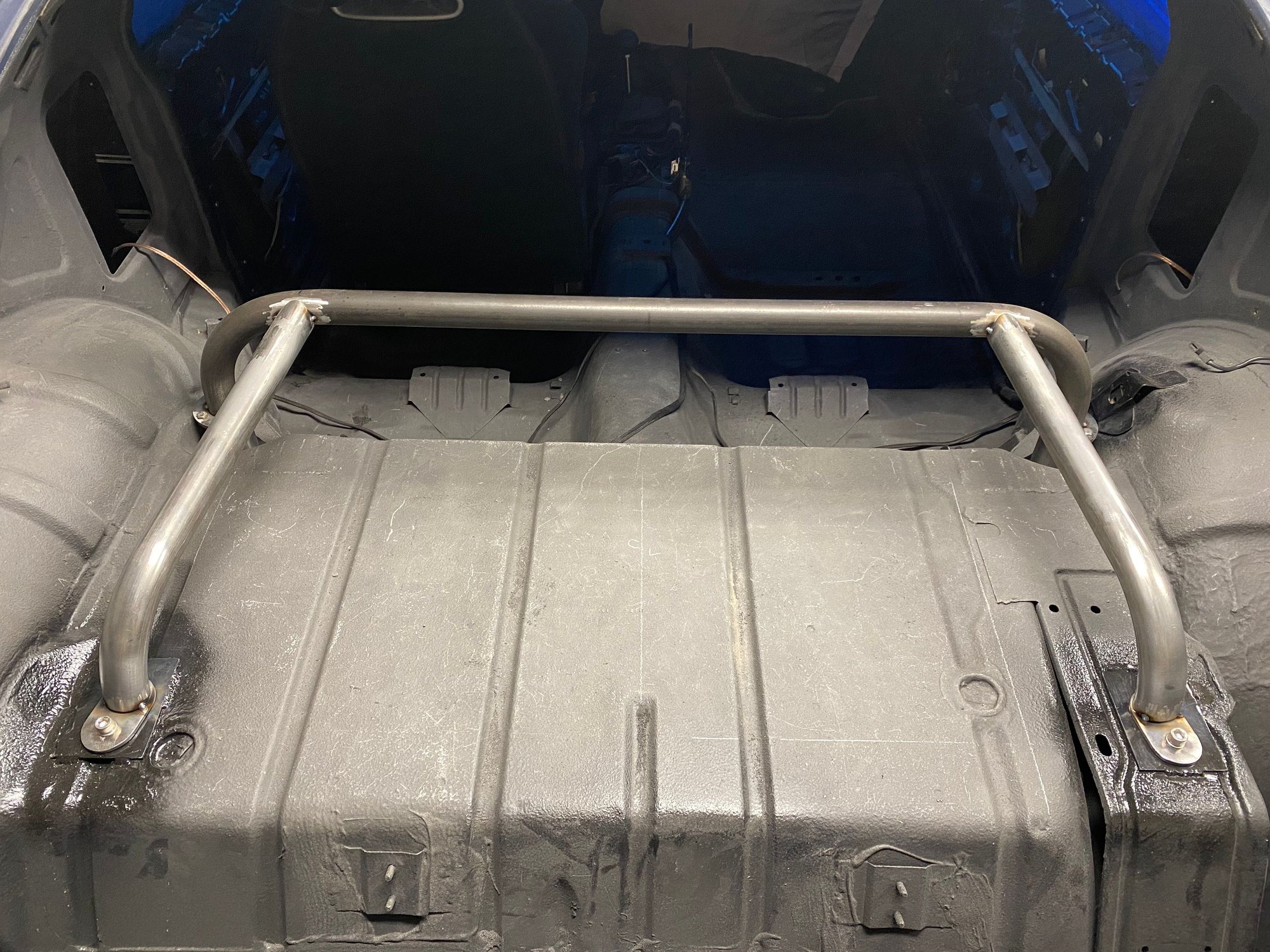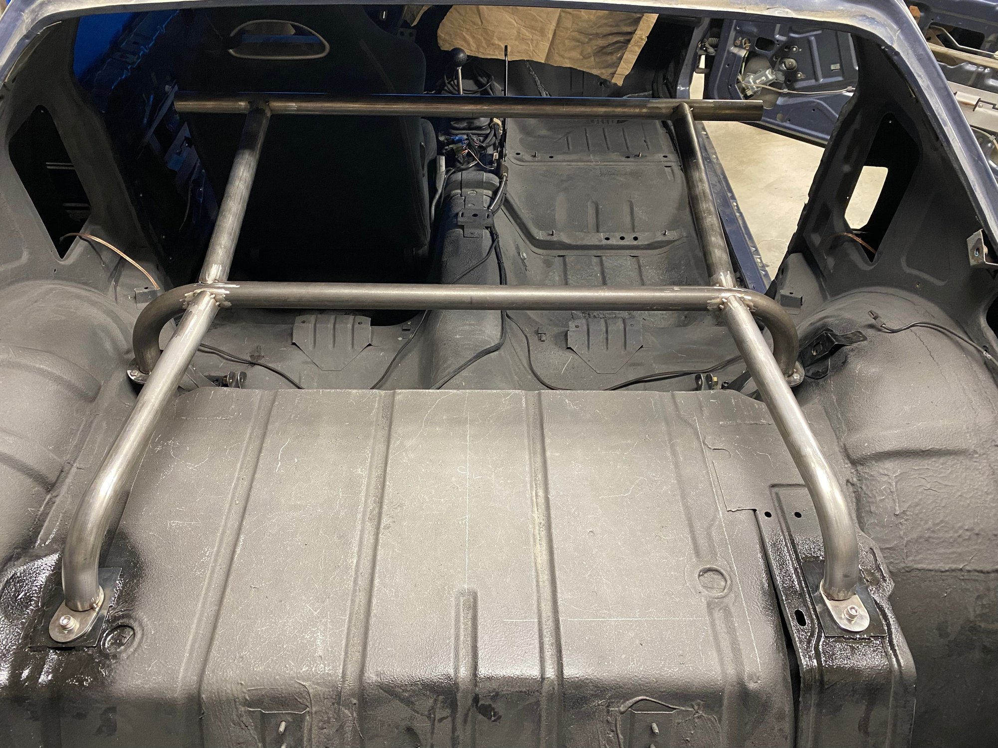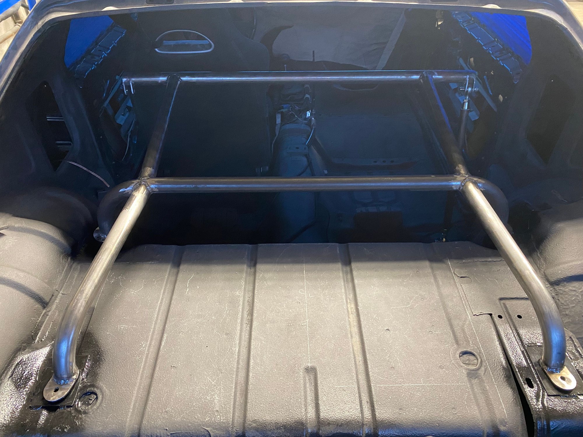I’ve decided to build a harness bar to compliment the Corbeau RRX seats and delete the rear seat in my car. I plan to auto cross the car and want a more secure harness than the original seat belts can provide. Receivers are welded to the unused upper rear shock locations Main cross bar Cross bar slides into the receiver Mock up of the rear outriggers The entire bar is at a 10 degree angle front to back Harness attachment bar “floats” behind the seats at shoulder height Down bars attach to the side of the harness bar and extend down to the rear seat belt pads. Completed test fit, ready for paint.