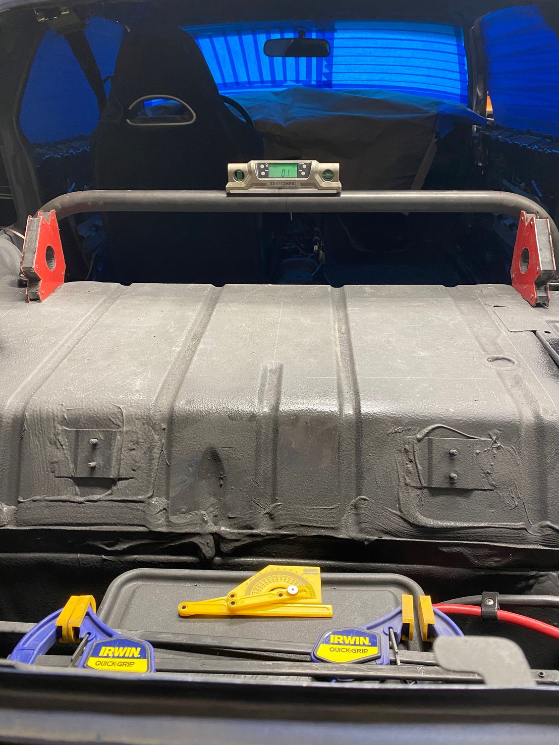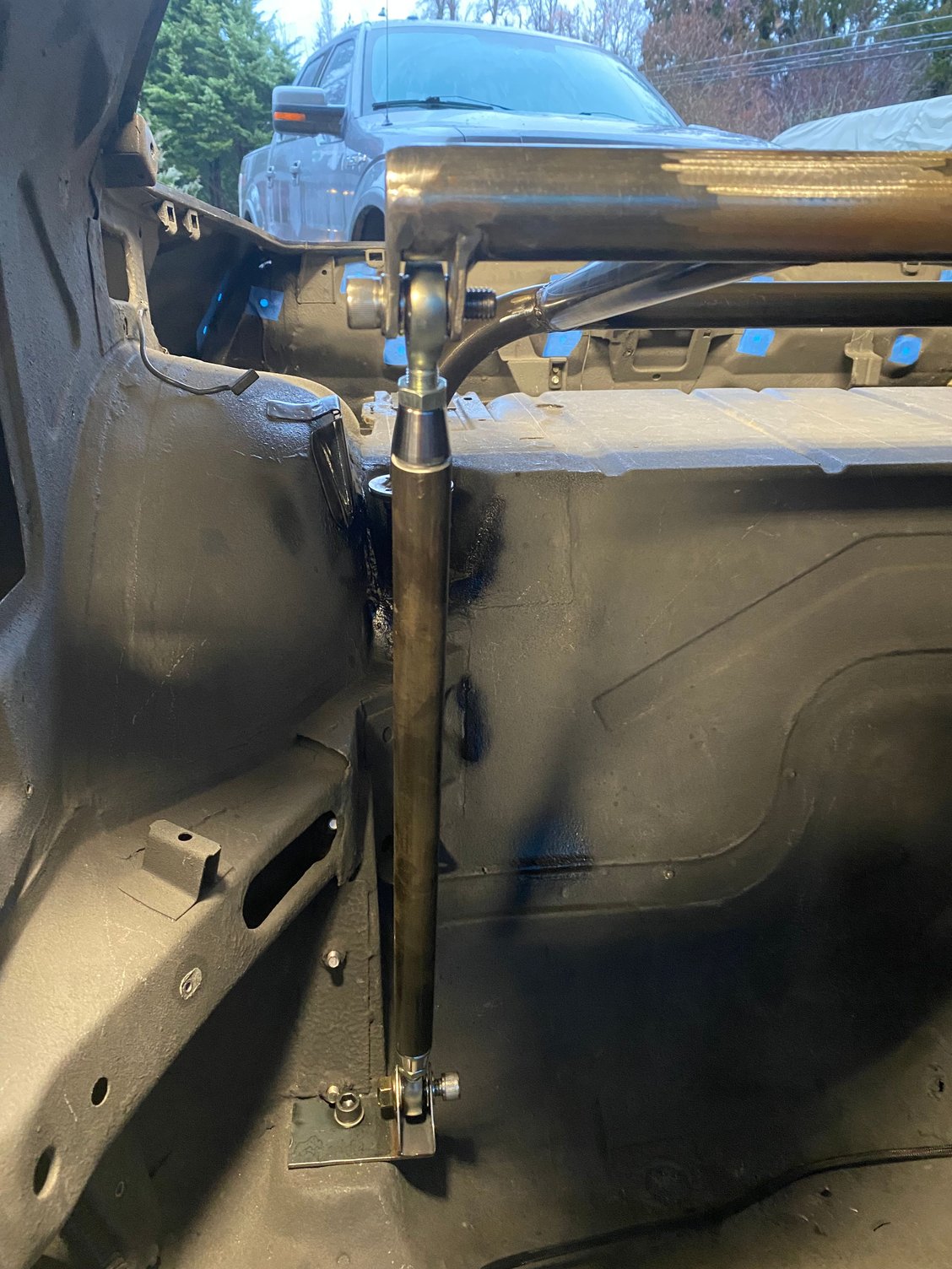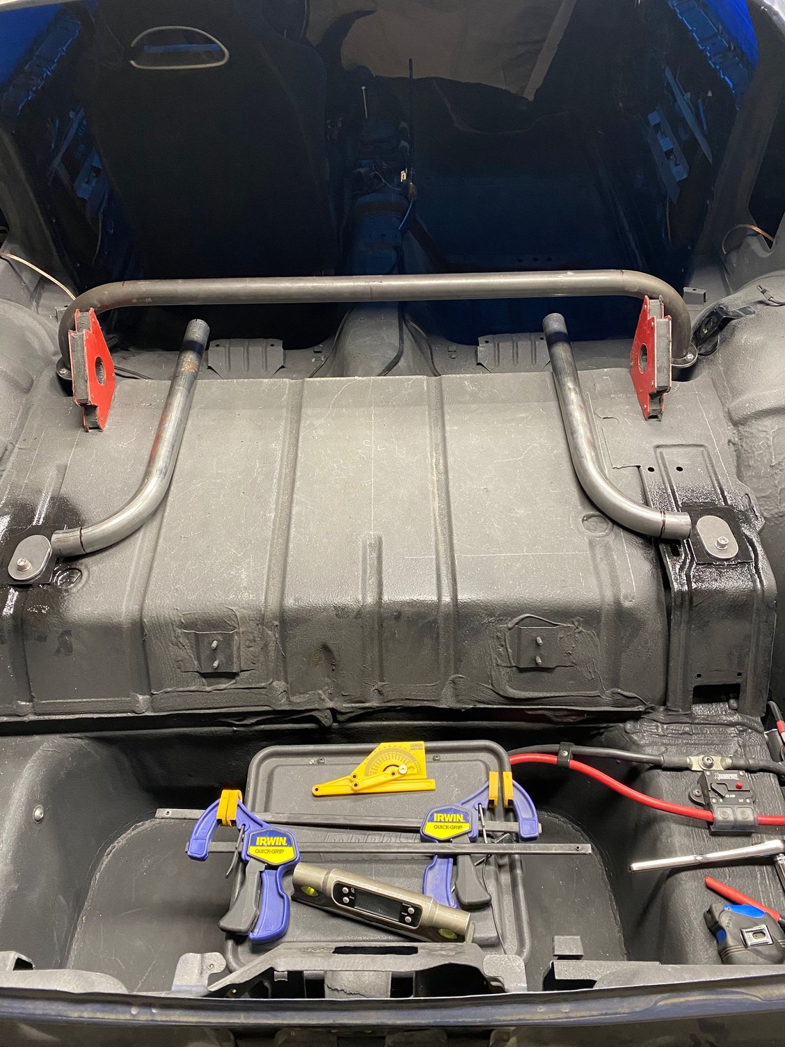 I’ve decided to build a harness bar to compliment the Corbeau RRX seats and delete the rear seat in my car. I plan to auto cross the car and want a more secure harness than the original seat belts can provide. Receivers are welded to the unused upper rear shock locations Main cross bar Cross bar slides into the receiver Mock up of the rear outriggers The entire bar is at a 10 degree angle front to back Harness attachment bar “floats” behind the seats at shoulder height Down bars attach to the side of the harness bar and extend down to the rear seat belt pads. Completed test fit, ready for paint.