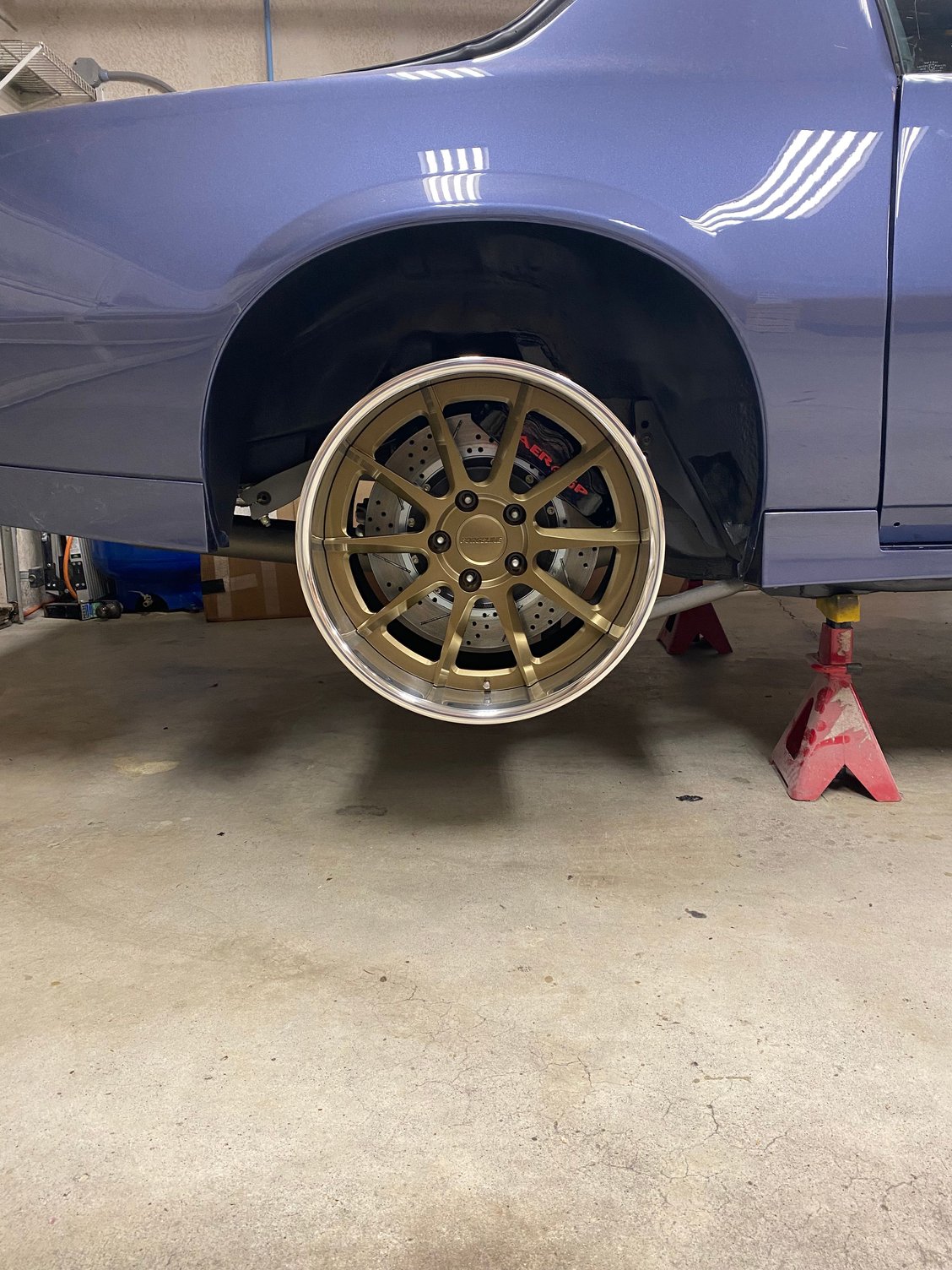 A sneak peek of the wheels that I am using. They are Forgeline RB3C with an anodized bronze center, polished outer rim, and satin black inner rim. The front are 18 X 9.5, 6.5” BS with a 275/35-18 RT660 and the rear are 18 X 11, 7” BS with a 315/30-18 RT660. I could not be happier with the color against the blue paint.