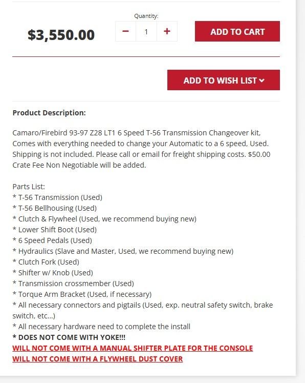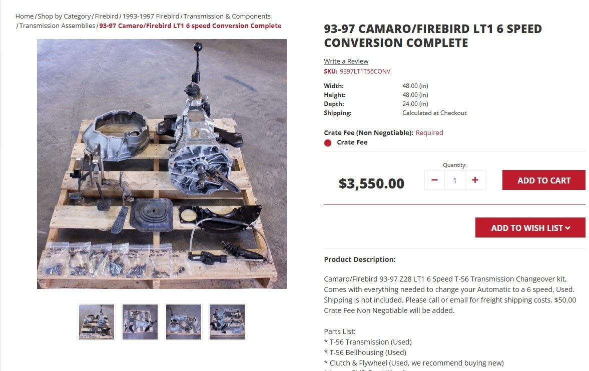 Hardware: your car would have come with a T-56 transmission. It is a 6 speed. Buying a used one will cost you, heck just finding a replacement for a broken one can be hard. Normal you can just buy a transmission and send in a core but T56 demand is so high you pretty much need to send yours in and have it repaired/rebuilt.