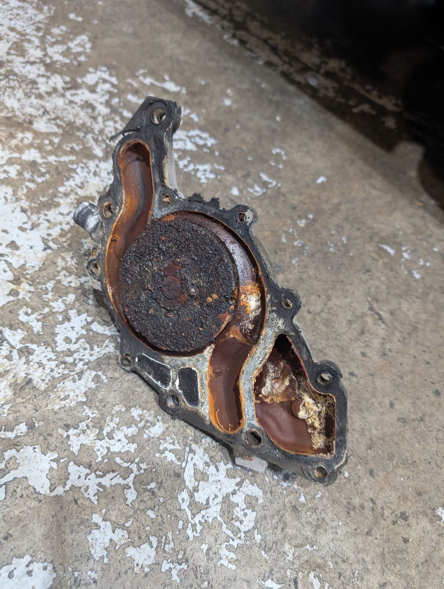 Got the new water pump and thermostat installed. Cleaned up the mating surface and knocked a bit of rust off the inside of the impeller area. It's not super pretty, but it works.