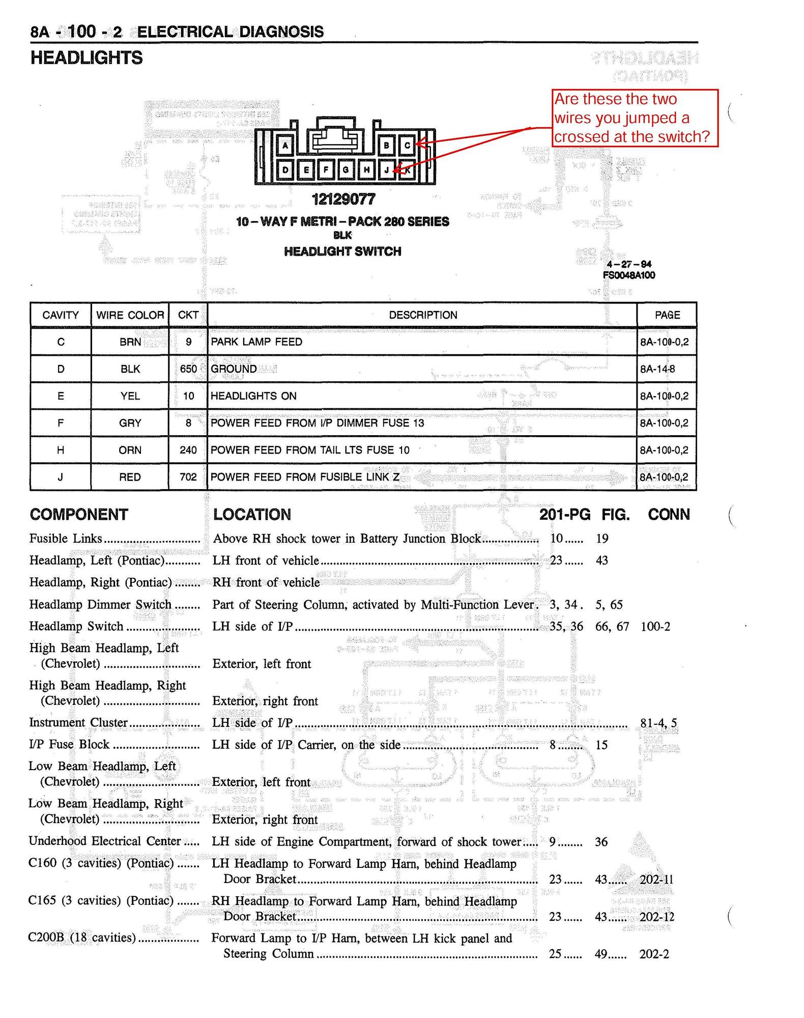 Ok, I got a razor blade, and gently went through the insulation on the H and J terminals, with the switch in the parking light ON position, and everything came on, including the dinger under the dash board. That is the first time since the crash the dinger came on. Now what do I do? I was sure the switch was bad. The fuses are all ok.