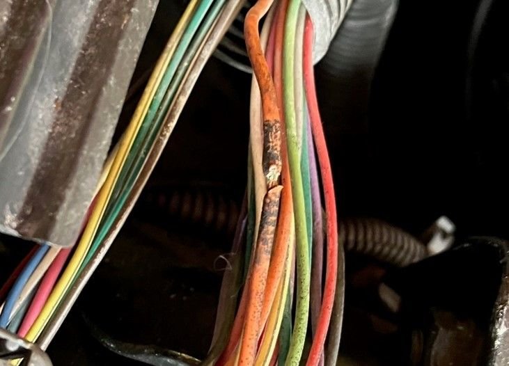 Picked up the PCM yesterday to do a conductivity test on the white cable going to the ICM (the one with the too high voltage causing repeated P1351's after installing new wires and plugs) and found a partly damaged cable under some dried out old tape, a orange cable in the corner of the black connector which seems to be one of the PCM power supply cables, a part of the plastic has been shaved off and the copper inside shows green corrosion.